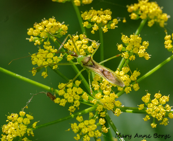 Insect pollination isn’t a given, though. These pollination partners have to evade the clutches of predators who would like to eat them, including spiders, and assassin bugs, like this cleverly disguised Zelus luridus. So Golden Alexander has self-polination as a back-up strategy.
