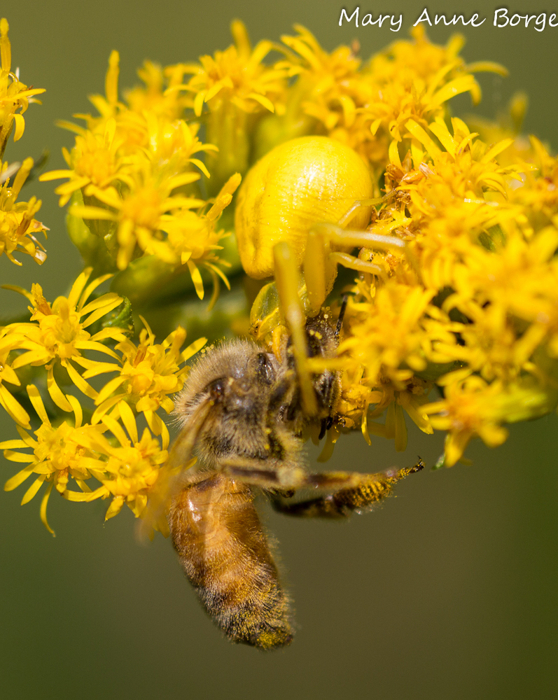 Goldenrods are essential plants, providing food for beneficial insects from mid summer through late fall. Visitors to the goldenrod banquet include many species of butterflies, bees, wasps, flies and others. Some of the visiting insects may become a meal for other insects, like the Crab Spider pictured here devouring a bee, or for birds or even mammals.