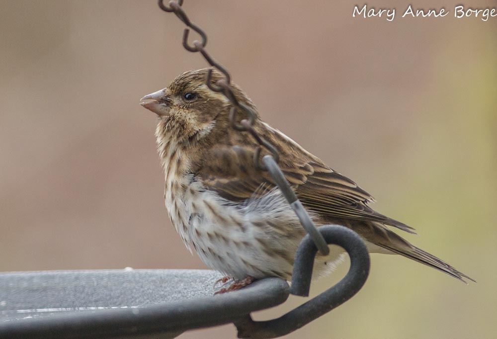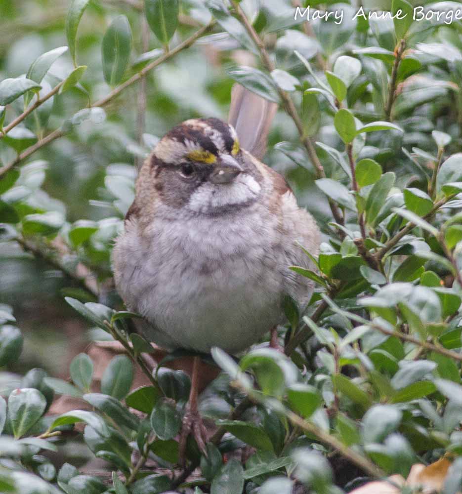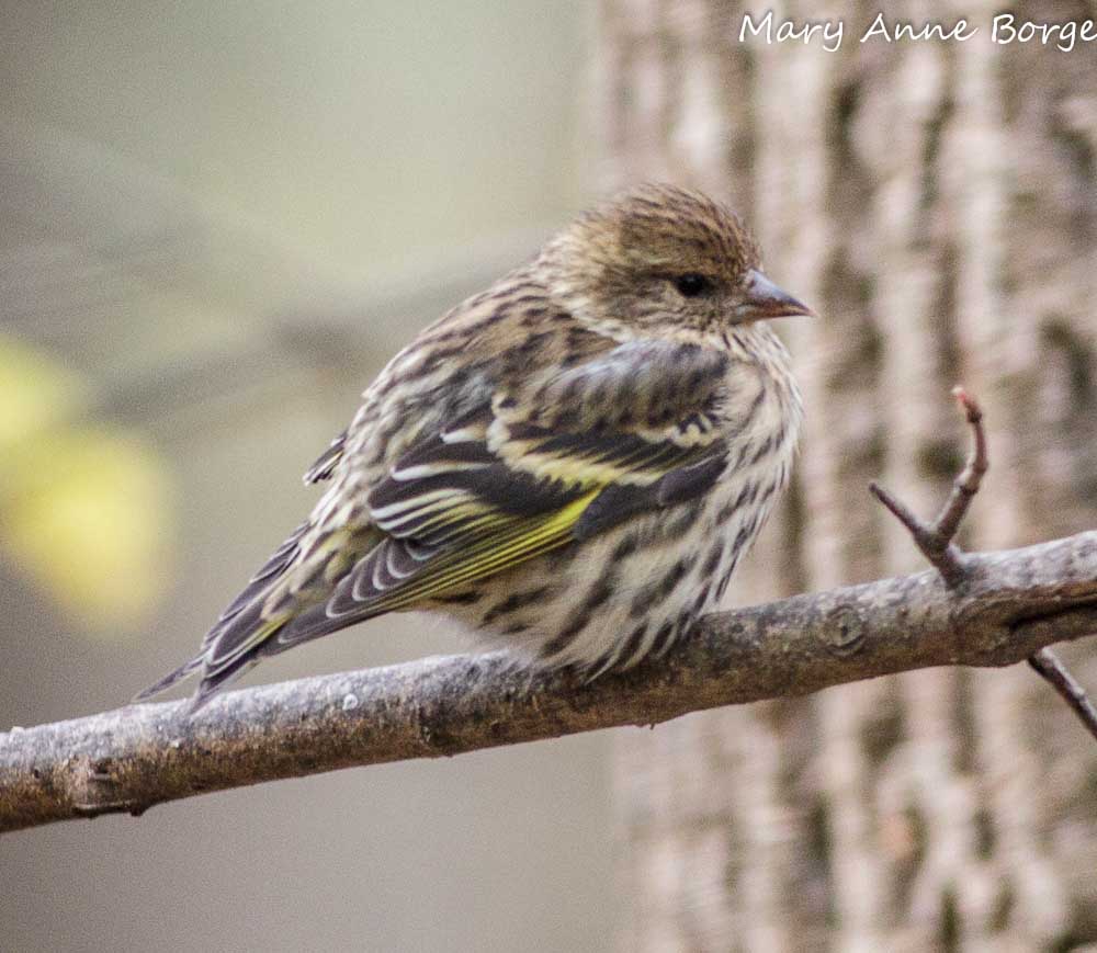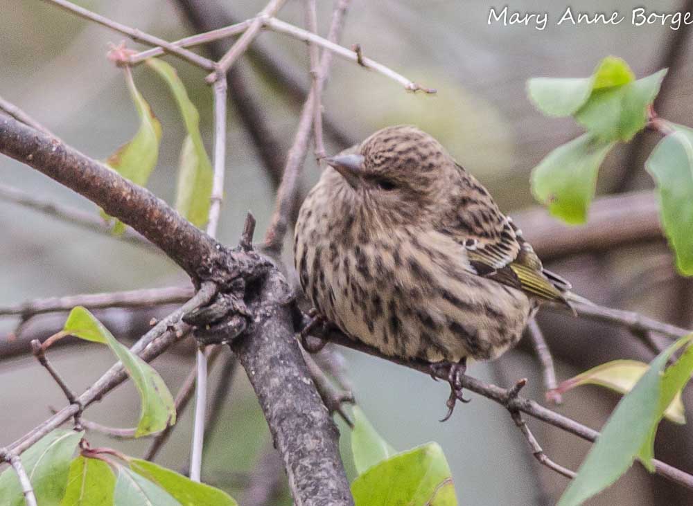 All of our year-round residents visited, undeterred by the weather.  Visiting Pine Siskins ganged up to empty our feeders in less than a day, chasing larger competitors away.  Even a female Purple Finch stopped by, and Juncos and White-throated Sparrows returned for the winter while the power was out.  Cedar Waxwings swooped in twice, eating any fruit they could find.