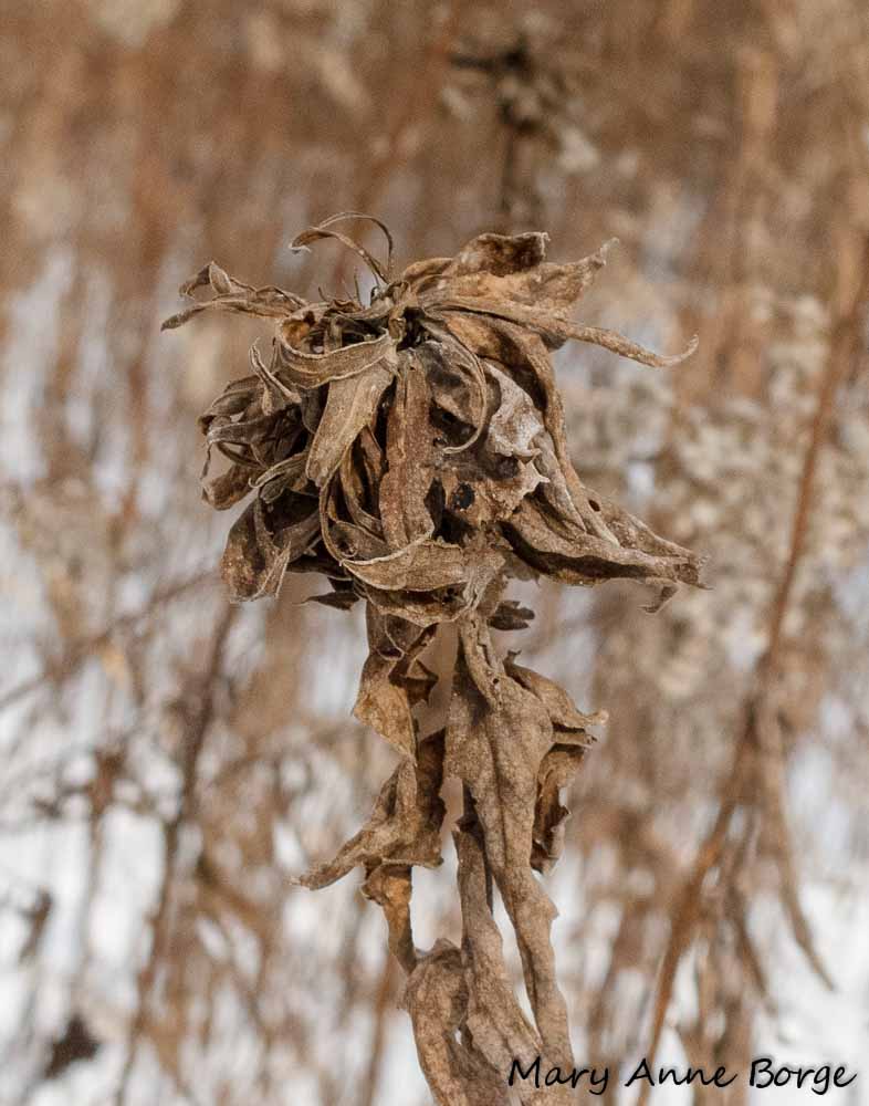 Goldenrod galls were evidence of insects overwintering. A gall is a growth that is a plant’s reaction to being used, or colonized, by another organism.  Galls generally don’t cause any harm to the plant.