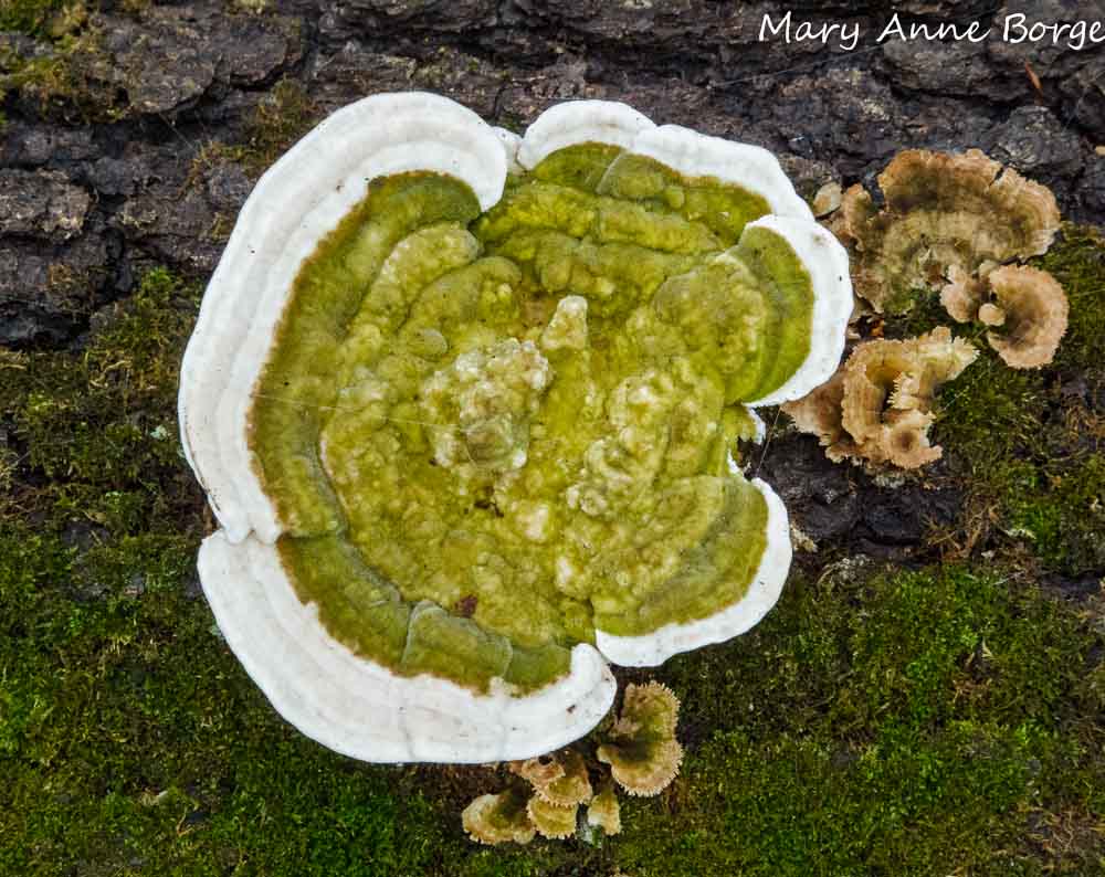 Soft light intensified the bright white and green of the Lumpy Bracket (Trametes gibbosa) mushroom, causing it to jump out and catch my eye.