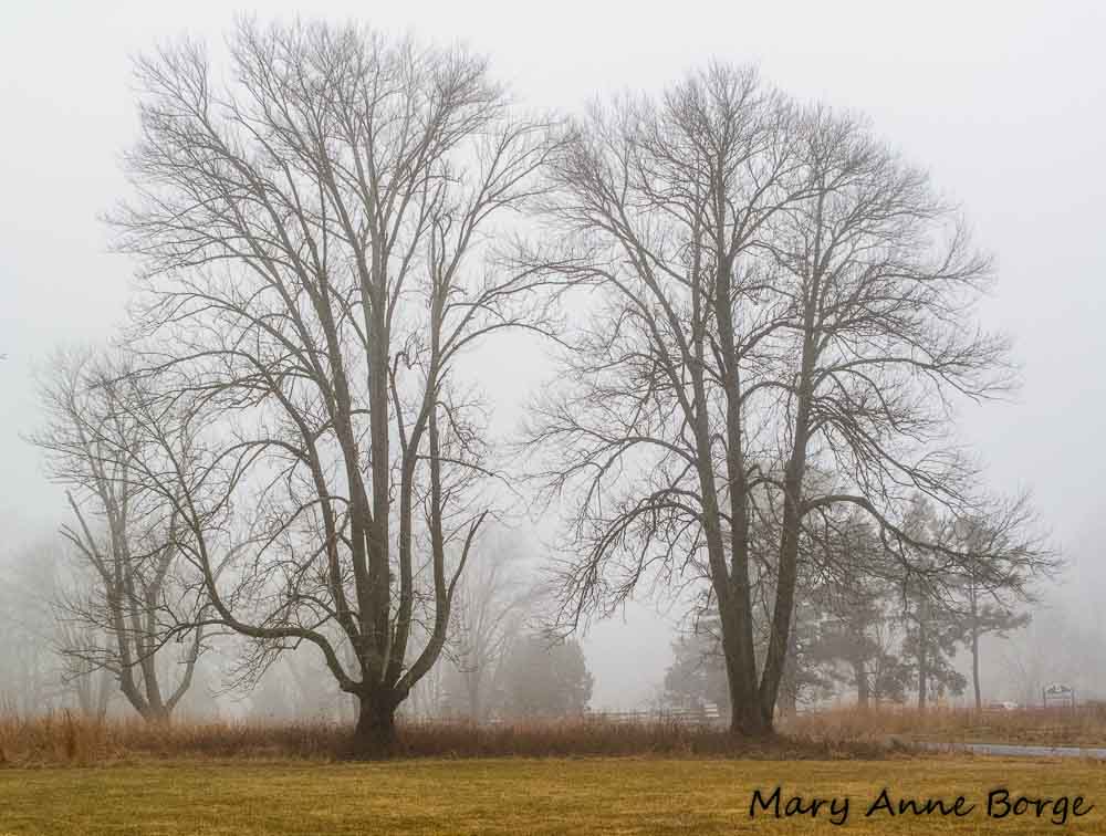 The weather this winter has been very variable, with warm temperatures and foggy conditions one day, followed by cold, wind and snow the next.  On one of the recent warm foggy days, I went for a walk at Bowman’s Hill Wildflower Preserve, just south of New Hope, Pennsylvania.  The misty air exaggerated everything – silence, sounds, colors and images.