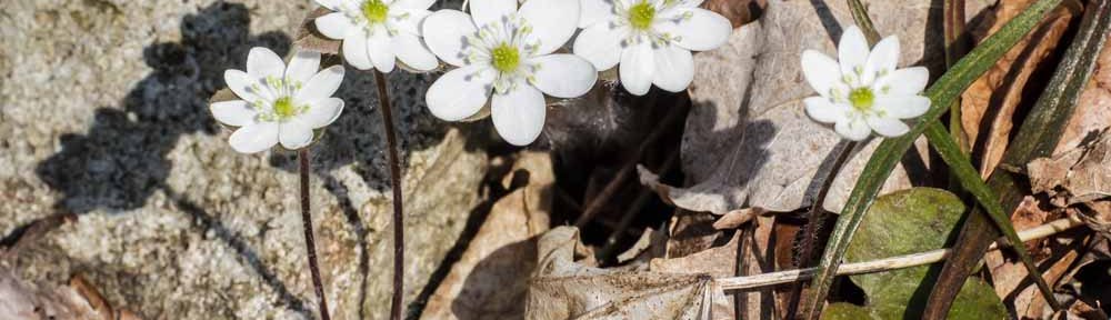 A special treat for me was seeing Round-lobed Hepatica (Hepatica Americana; synonym Anemone americana) growing from rock crevices and through leaf litter, in colors ranging from deep violet to pure white.