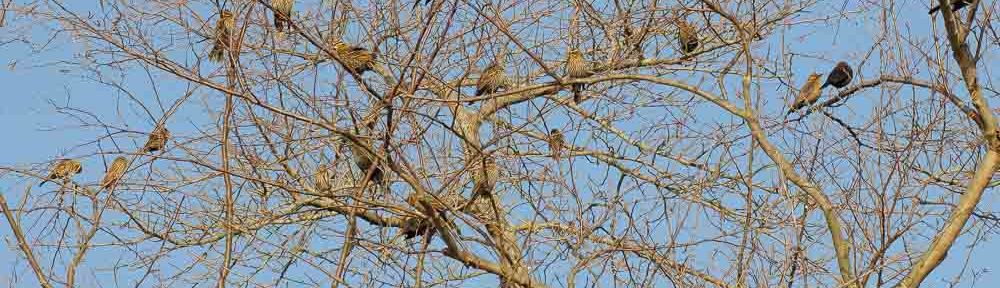 A mixed flock of migrating Red-winged and Rusty Blackbirds paused in the bare branches of trees overlooking the feast, to rest and refuel before continuing their journey.