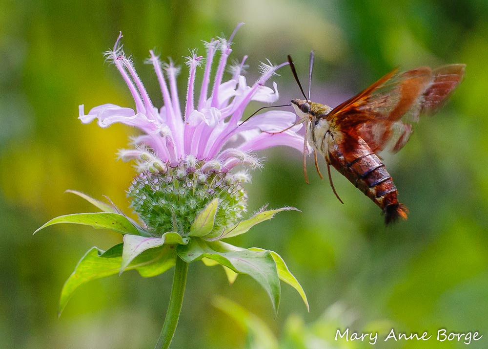 Hummingbird Clearwing Moth (Hemaris thysbe) drinking nectar from Wild Bergamot (Monarda fistulosa)