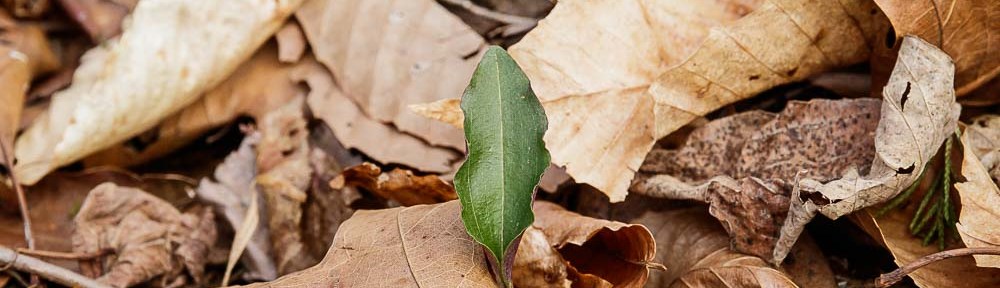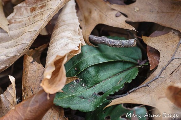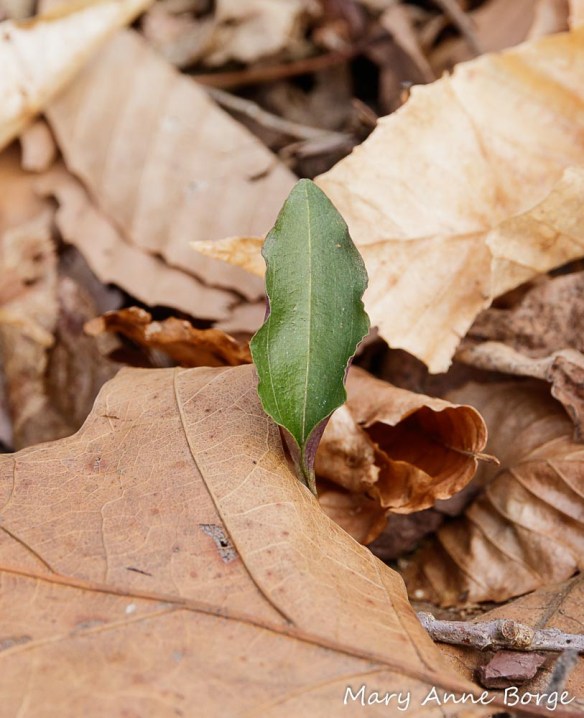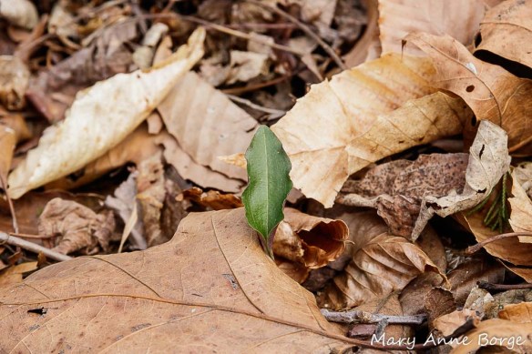 On a recent walk in the woods, I spotted the leaf of a Cranefly Orchid (Tipularia discolor) peeking out from beneath a covering of fallen leaves, an oak leaf its top blanket.