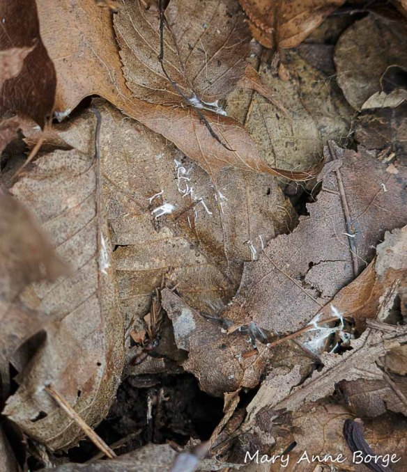 The white cottony strands are fungal mycelium, working to decompose the fallen leaves