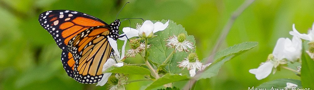 I wasn’t the only one to discover the Blackberries in bloom. From a distance, I could see that at least three Monarch butterflies were already there, flirting and drinking nectar, drawing me in to get a closer look.  They were my first certain Monarch sighting of the season.