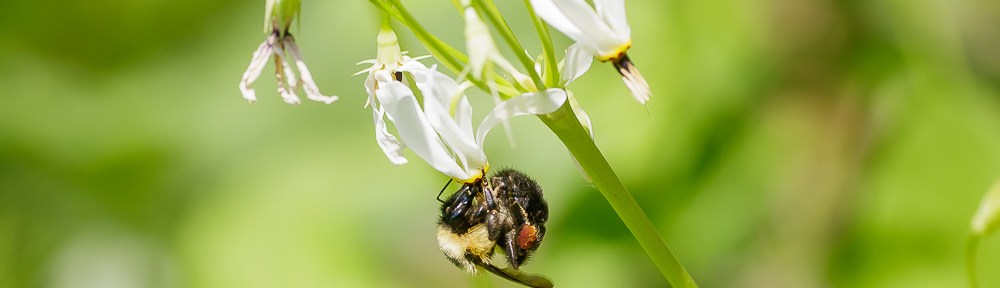 Queen Bumble Bee on Shooting Star (Dodecatheon meadia). The flower’s stigma is touching the bee’s abdomen. Notice the dusting of pollen that is beginning to accumulate.