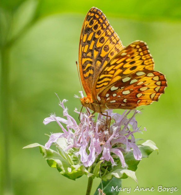 Great Spangled Fritillary butterflies drink nectar from many flowers, including the Wild Bergamot (Monarda fistulosa) shown here, but their caterpillars can only eat the leaves of violets.