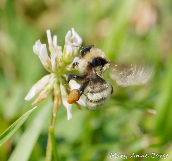 Let’s take White Clover (Trifolium repans) as an example. Native Bumble Bees are important pollinators for both native plants and agricultural crops, and are frequent visitors to White Clover flowers, eating and harvesting pollen and nectar.