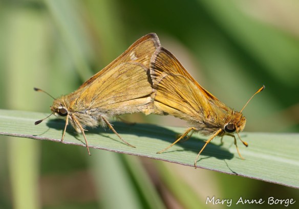 Got crabgrass? This pair of Sachem will thank you, because the female can lay her eggs on crabgrass, one of the few plants her caterpillars are able to digest.