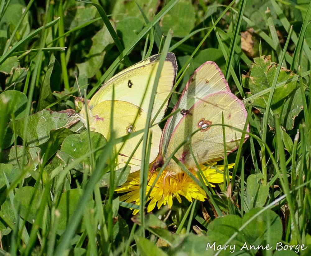 Some butterflies who specialize on Pea (Fabaceae) family members as caterpillar food use White Clover. The females lay eggs on the plant, and after hatching, the caterpillars munch on White Clover flowers or leaves. The female Clouded Sulphur in the photo below is drinking nectar from a dandelion. If the male Clouded Sulphur is successful in persuading her to mate with him, there is White Clover nearby for egg-laying.
