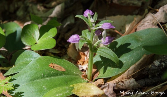 Blooming in mid-spring, Showy Orchis (Gaelaris spectabilis), also known as Showy Orchid, peeks out from its home on the forest floor from beneath the leaves of other species that tower above it.