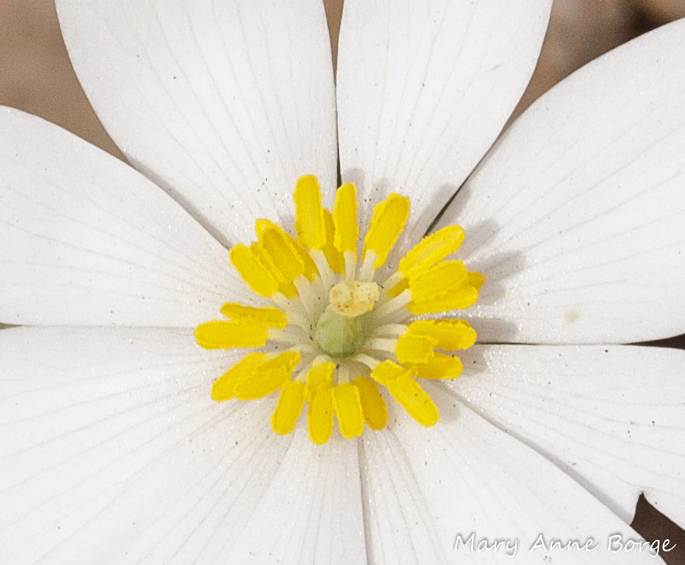 Bloodroot (Sanguinaria canadensis) flower. Notice the pollen around the edges of the anthers where they have opened to make pollen available.