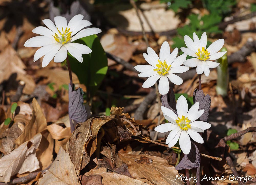 With each sunny day more flower shoots make their way through their winter blanket of fallen leaves. As Bloodroot emerges, it leads with a flower stem, each one wrapped by a single leaf.