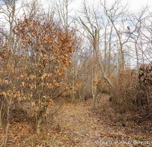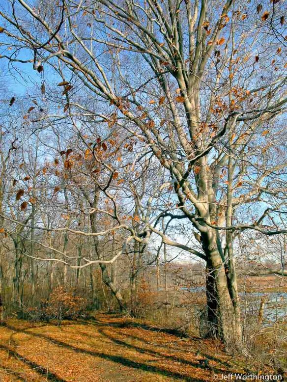 It can be surprising to see leaves clinging to deciduous trees in mid-winter. In eastern North America, some oak species and American Hophornbeam (Ostrya virginiana) may retain their leaves but American Beech (Fagus grandifolia) trees are among the most conspicuous to do so. By January its leaves are bleached to a papery pale tan, catching the bright winter light while fluttering in the winter wind. The leaves look delicate, but give one a tug and you’ll see how tenaciously they adhere to their branches. American Beech leaves typically stay on the trees until early spring, withstanding the effects of even ice and snow.