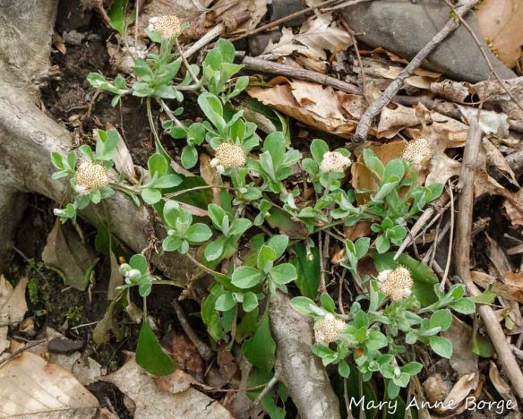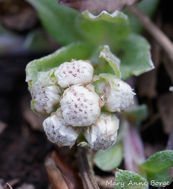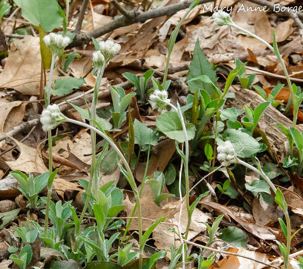 Plantain-leaved Pussytoes (Antennaria plantaginifolia) bloom in early spring, their flower shoots and leaves emerging from the soil as the temperatures warm and the days lengthen. The common name ‘Pussytoes’ comes from the resemblance of the tight flower clusters to a cat’s paw, especially when the flowers are still in bud. Both the common and scientific (plantaginifolia) names refer to the appearance of the mature leaves of this plant, which resemble those of the Plantains (Plantago species). The leaves remain green throughout the winter.