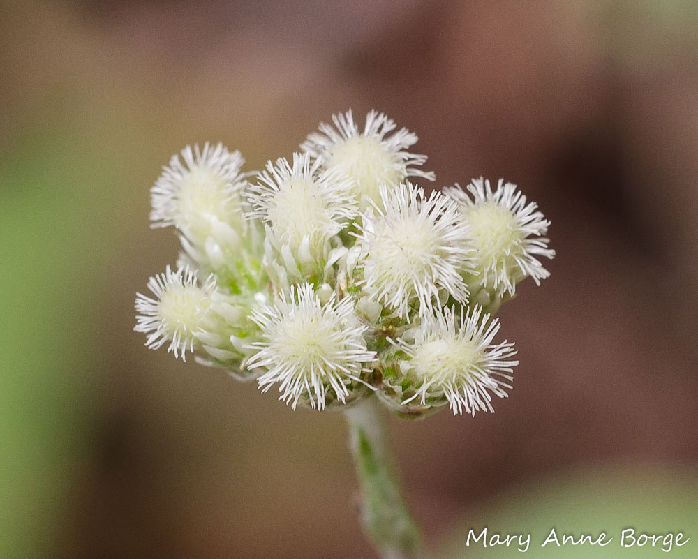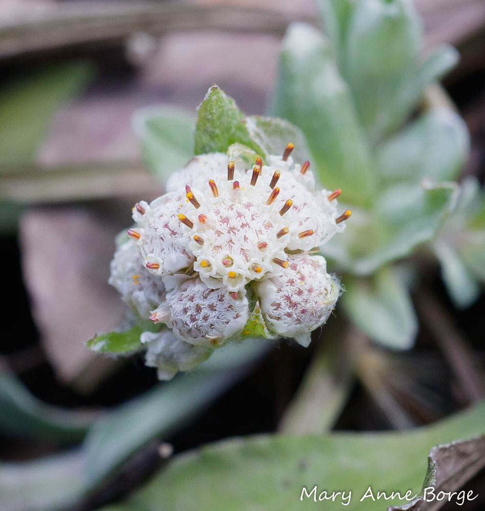 Plantain-leaved Pussytoes are Aster (Asteraceae) family members. Each toe-shaped inflorescence (flower cluster) consists of small tubular ‘disk’ flowers typical of this family. Somewhat less common in an herbaceous plant (one that’s not woody) is the fact that Plantain-leaved Pussytoes have male and female flowers on separate plants. As the flowers open, they reveal their sex. In the male flowers, the stamens (the male reproductive parts) emerge above the tubular corolla, transforming the inflorescence’s appearance from pussytoe-like to more of the look of a white-iced cupcake covered with birthday candles. In a close-up, a stamen also resembles a box of popcorn (at least to me), with the emerging pollen playing the role of the popcorn spilling out of the box.