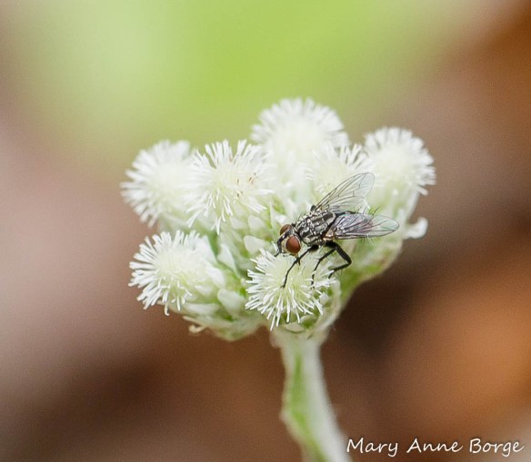A flesh fly (Sarcophaga species) foraging on Plantain-leaved Pussytoes (Antennaria plantaginifolia) with female flowers