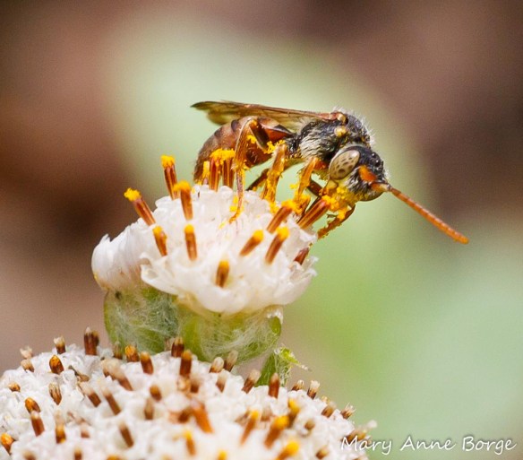 A Cuckoo Bee (Nomada species) feeding on Plantain-leaved Pussytoes (Antennaria plantaginifolia) with male flowers. The red-striped stamens with yellow pollen at the top look a bit like a box of popcorn.
