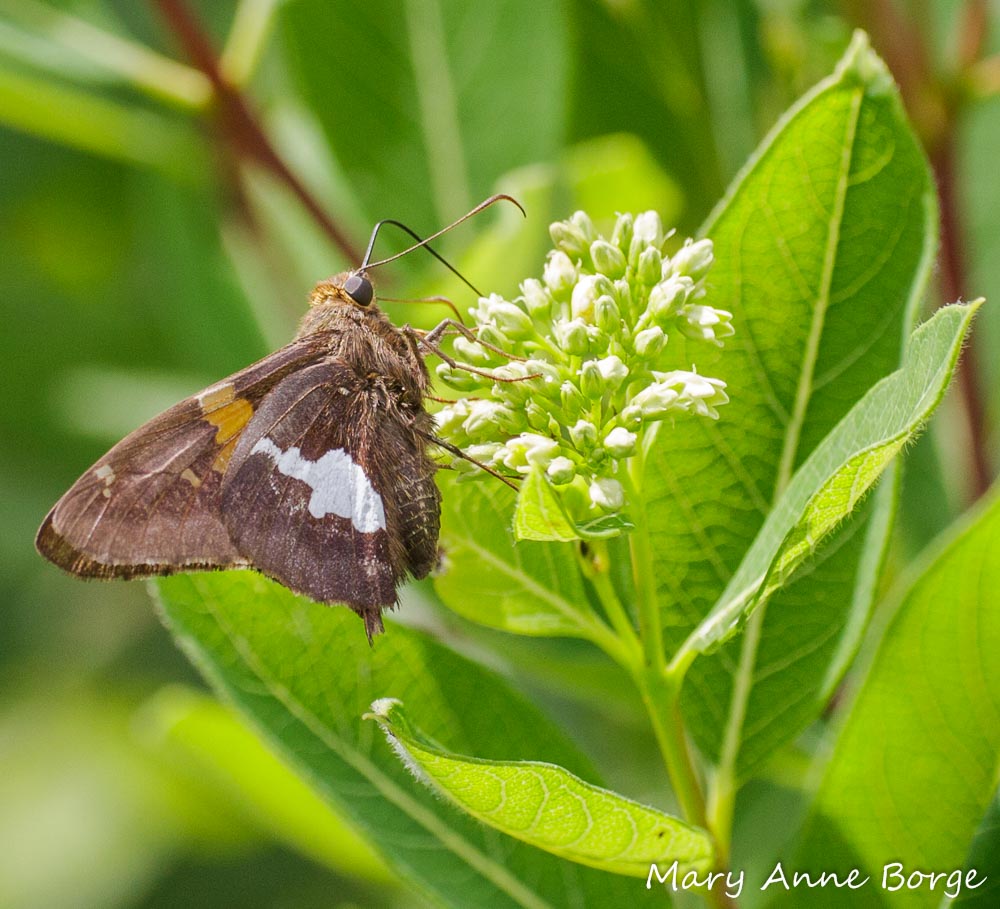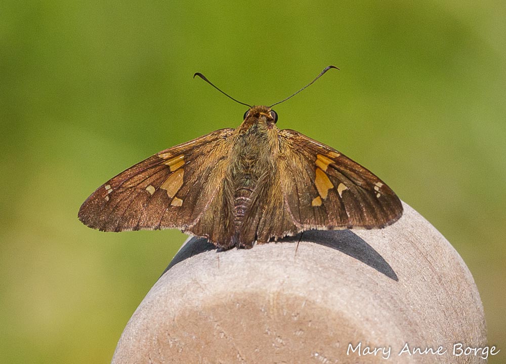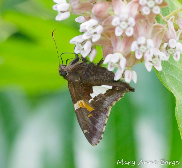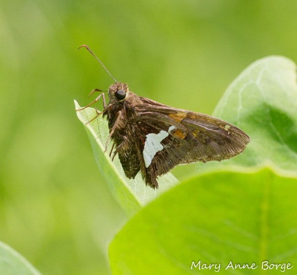 I have to wonder if the silvery wing spot is an adaptation to make this butterfly resemble bird droppings. Insects, even butterflies, can be an important source of food for birds and some predatory insects. This disguise would likely give Silver-spotted Skippers some protection from these predators, since bird droppings don’t attract them.