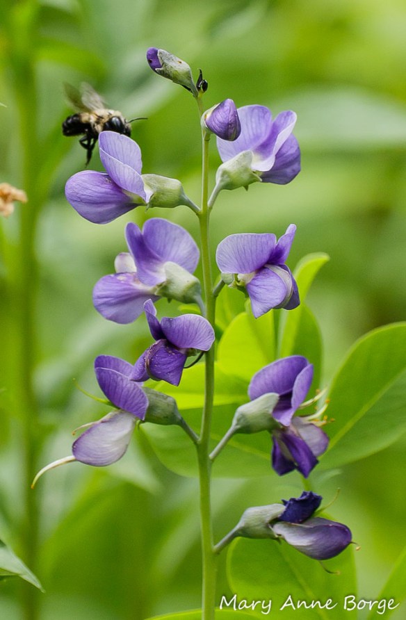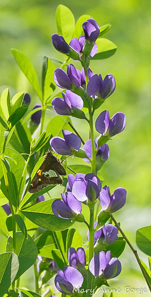 Some of the food plants on which the Silver-spotted Skipper caterpillars depend are especially garden-worthy. Blue False Indigo (Baptisia australis), also called Blue Wild Indigo, and other plants of this genus are potential food plants for Silver-spotted Skipper caterpillars. Its vivid purplish-blue flowers are primarily pollinated by Bumble Bees, but they are visited by other insects as well. Blue False Indigo can grow to a maximum height of about 4 to 5 feet (1.25 to 1.5 meters), likes full sun to part shade, and can tolerate dry and clay soils.