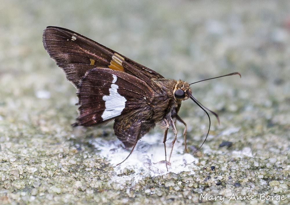 Silver-spotted Skipper, eating minerals from bird droppings. Does that silver splotch on the wings seem like a good disguise?