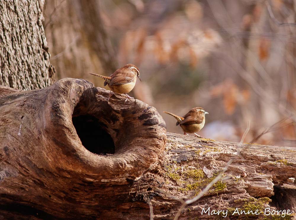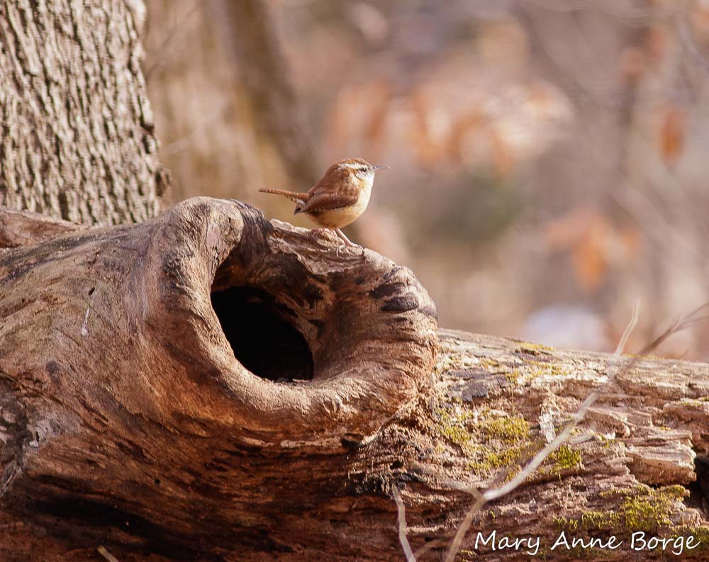 Every morning now I hear Wrens, Cardinals, Titmice and other birds singing. For several weeks Carolina Wren couples have been out shopping for real estate, looking for a good location to build a nest for the upcoming season. These birds nest in cavities, usually from three to six feet off the ground. A stump with a pre-made cavity like the one that the couple in the photos below is inspecting looks like very a very desirable property.