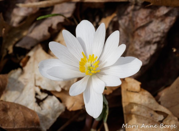Bloodroot (Sanguinaria canadensis) has opened its blossoms, hoping for insect visitors to help it with cross-pollination, but if all else fails it will self-pollinate.