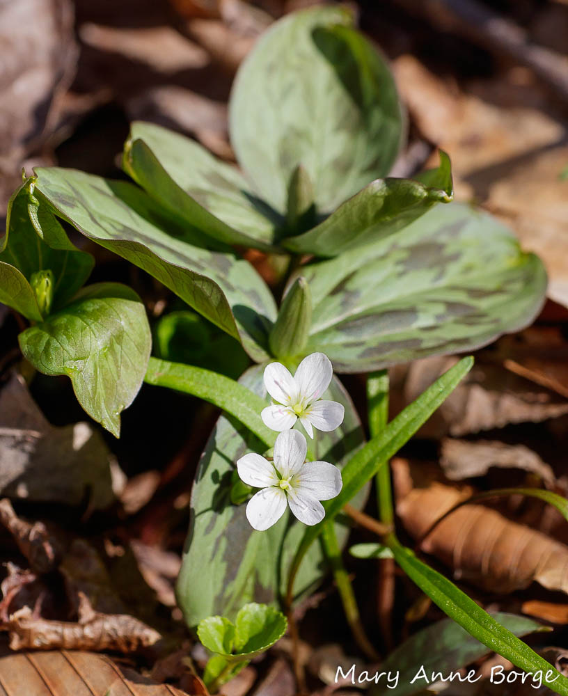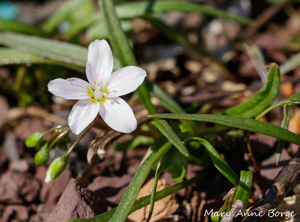 The first Spring Beauty (Claytonia virginica) flowers are open, the beginning of several weeks of a floral display from this species. There are specialist bees that depend on the pollen of this species as the only food that their larvae can digest. In return, these bees are very efficient and reliable pollination partners for Spring Beauty.