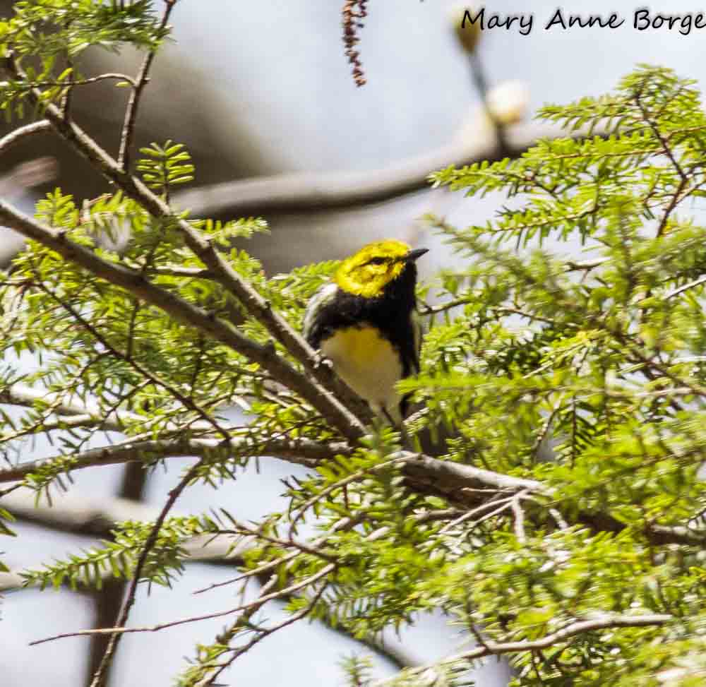 Black-and-white Warblers appeared, and a Blue-headed Vireo was busy hunting for lunch, moving from branch to branch, tree to tree. A Black-throated Green Warbler peered out from the shelter of a Hemlock tree.