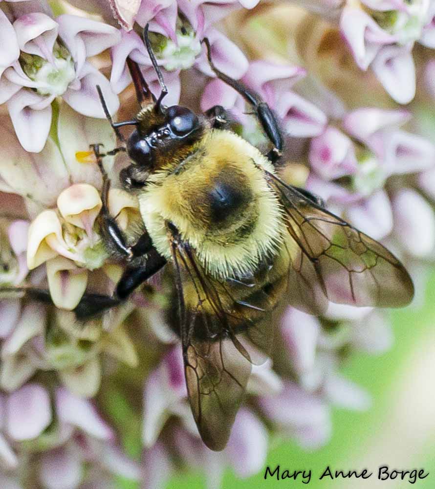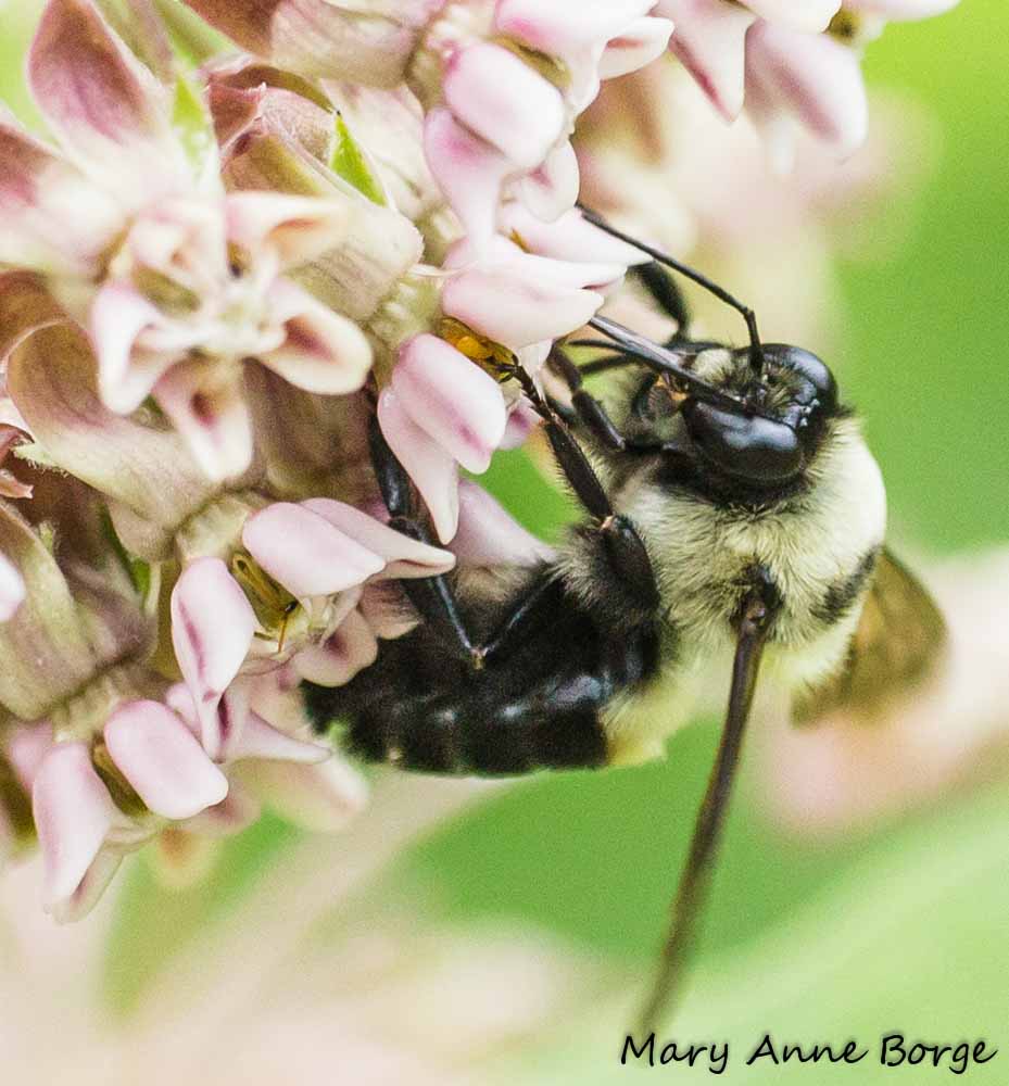 Bumble Bee engaging pollinia of Common Milkweed (Asclepias syriaca)