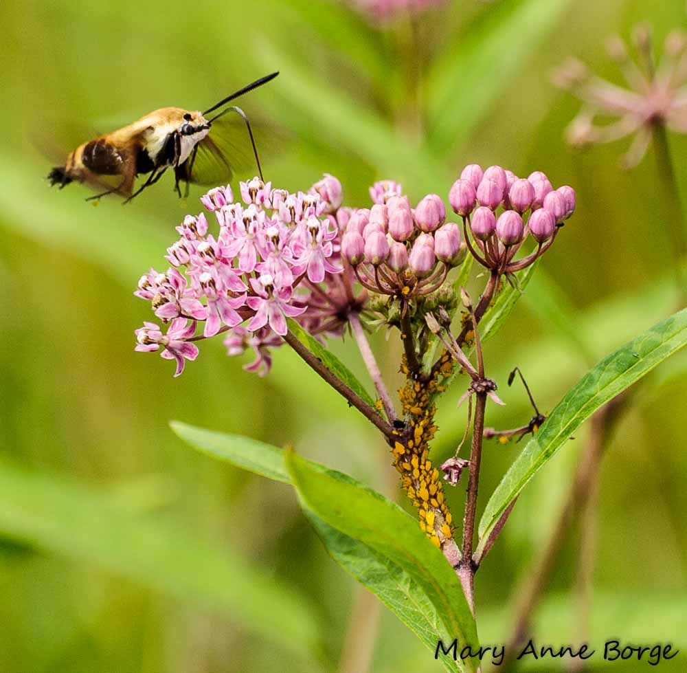 Snowberry Clearwing Moth (Hemaris diffinis) and Oleander Aphids (Aphis nerii) on Swamp Milkweed (Asclepias incarnata)