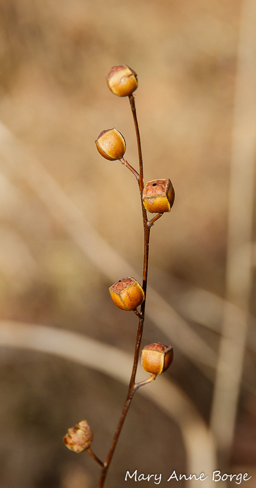 Attached along the length of the standing stems of this plant are fruit capsules that look like perfectly carved wooden boxes, each with a convex top and rounded bottom, and with elaborate designs that appear to be carved on the cube’s lid.