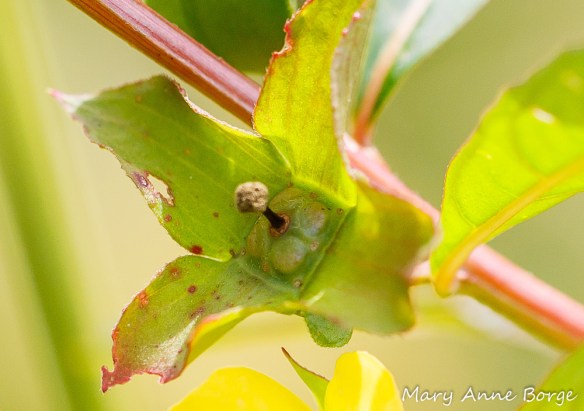 The face of a Seedbox fruit capsule records the history of its pollination story. The four large-ish evenly spaced ovals in each quadrant on the top of the fruit capsule were the nectaries, the source of the beverage that enticed the flower’s visitors.