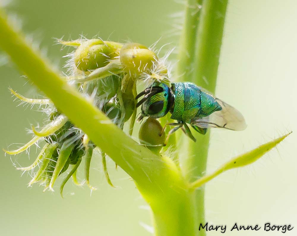 This jewel-like creature is a Perilampid wasp, one of several parasitic wasps that specialize on various insect species as their prey, including some other parasitites.