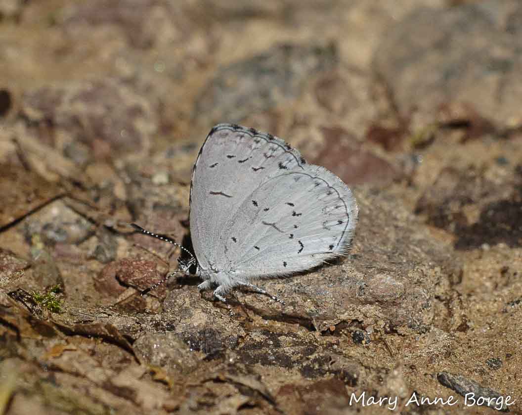 Spicebush (Lindera benzoin) is blooming, too, and the Spring Azure in the photo below is taking advantage of the nectar offered by the starburst yellow flowers. At first I couldn’t understand why she was practically laying on her side while she sipped. It seemed like an unusual posture for a nectaring butterfly, until I finally realized that she was positioning herself to catch the sun’s rays on a slightly cool and breezy spring day. Very efficient!