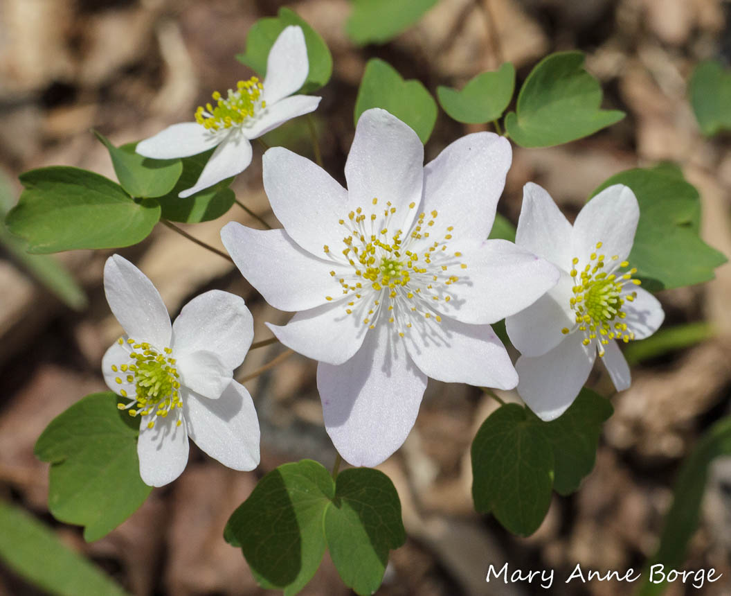 This week Bloodroot is already developing fruit capsules. Trout Lily is still blooming on warm days, but will finish soon. New stars have emerged from the obscurity of their winter blanket of fallen leaves to take center stage. Rue Anemone (Thalictrum thalictroides), completely invisible a week ago, is now in full bloom.
