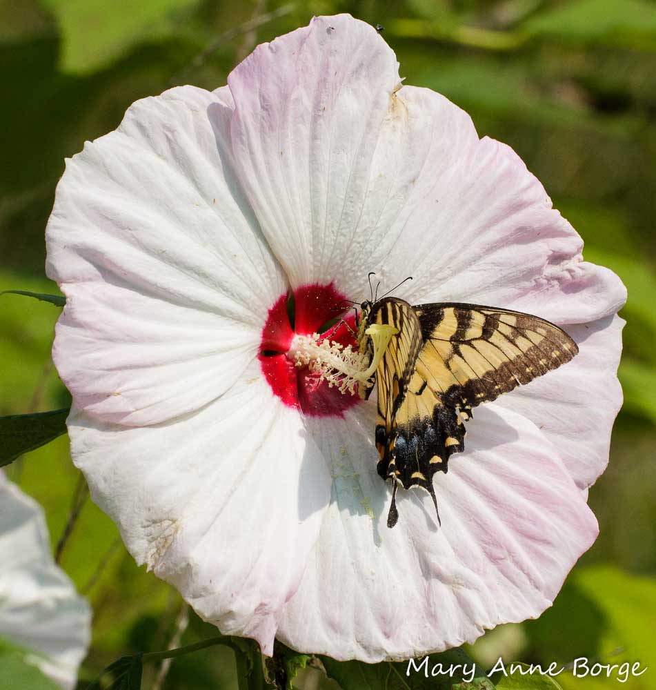 Eastern Tiger Swallowtail nectaring at Swamp Rose Mallow (Hibiscus moscheutos). The butterfly’s wings and body brush against the flower’s stigmas, depositing pollen, then against the anthers, picking up pollen.