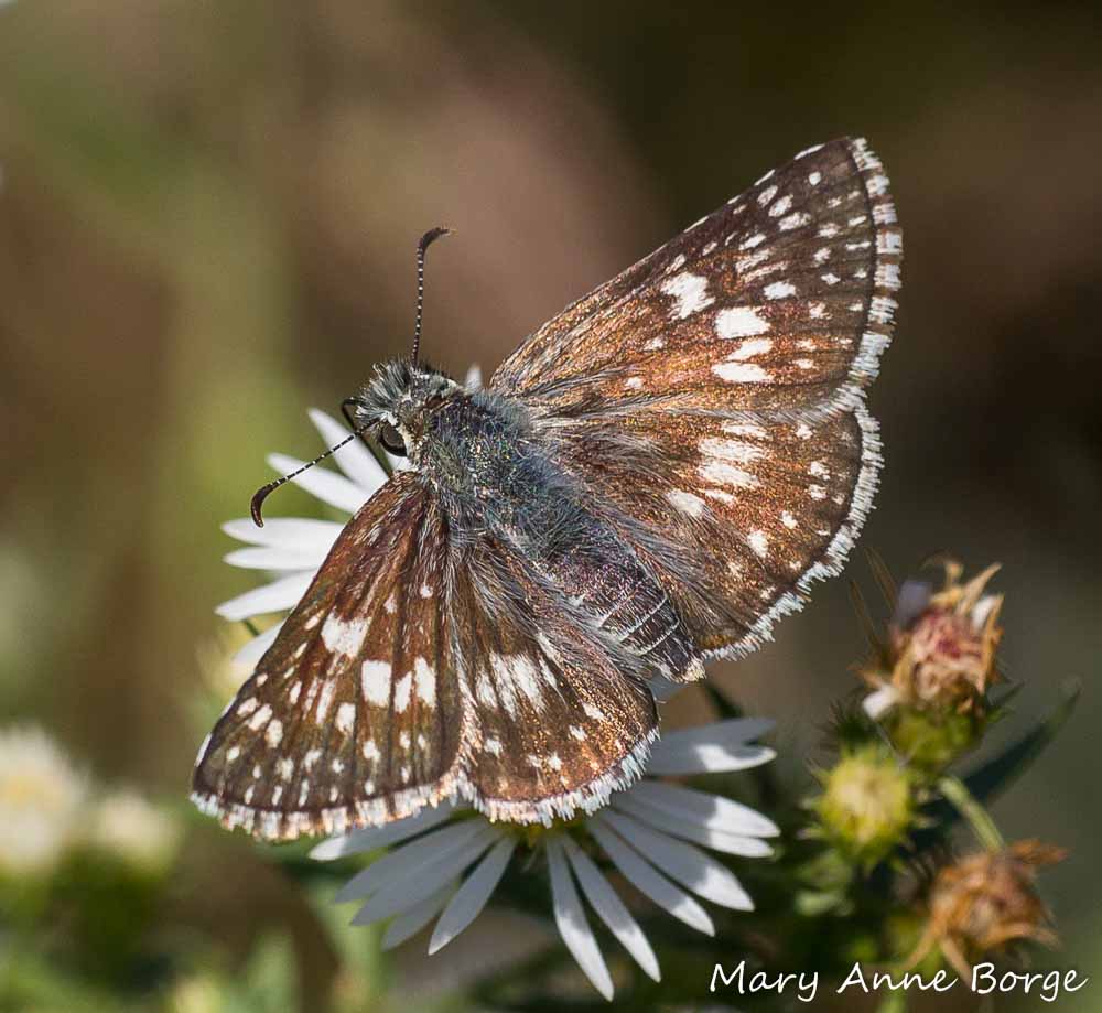 Common Checkered-skipper on aster. The caterpillars of the Common Checkered-skipper butterfly have evolved to eat plants from the Mallow (Malvaceae) family.