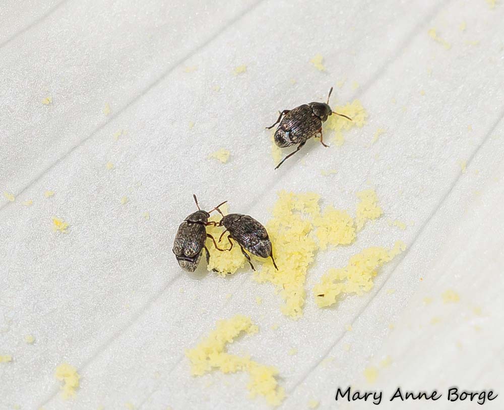 Bee and Hibiscus Seed Beetles (Althaeus hibisci) scavenging for pollen that has fallen onto the petals of a Swamp Rose Mallow (Hibiscus moscheutos) flower.