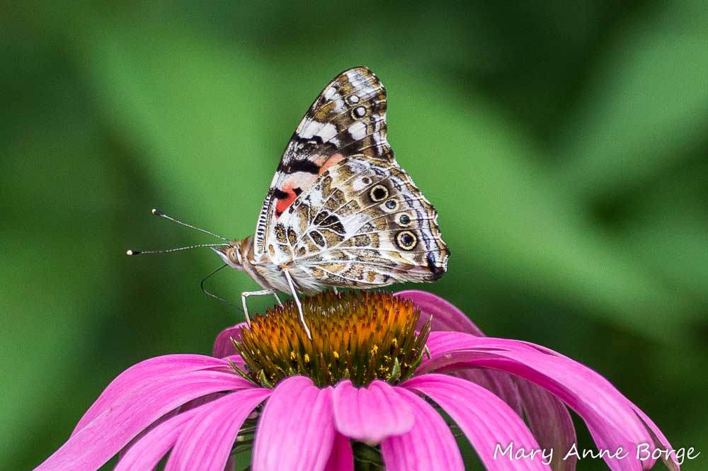 Painted Lady on Purple Coneflower (Echinacea purpurea). The Painted Lady is the most widespread butterfly in the world. It is a generalist, with its caterpillars able to eat plants from the Mallow (Malvaceae) and Pea (Fabaceae) families, along with thistles, sunflowers and many other plants.